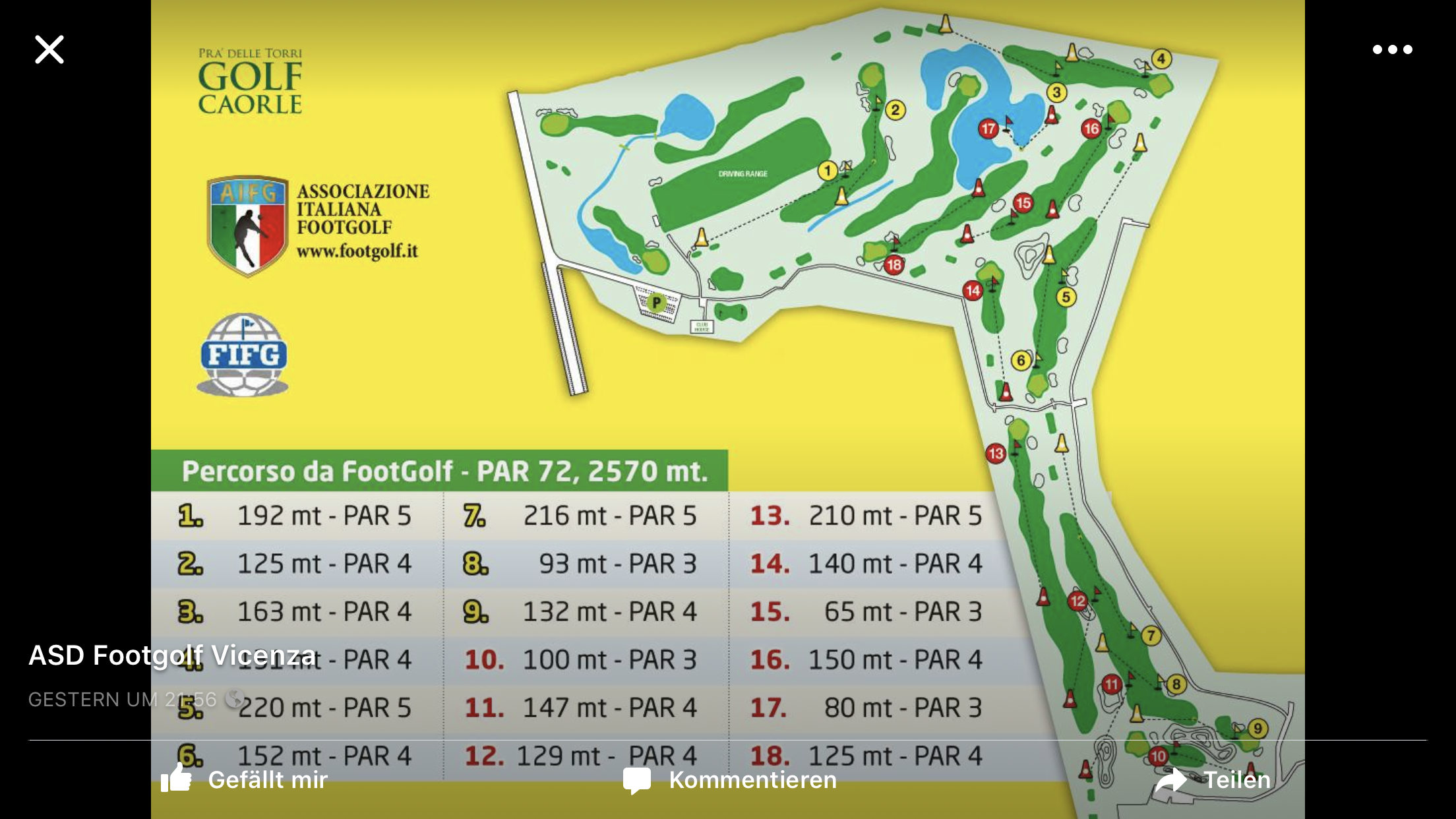 Il Pra' delle Torri Golf è il primo Circolo del Veneto ad aver aperto un percorso 18 buche da Footgolf. In questi primi anni il percorso è stato modificato e migliorato raggiungendo una qualità molto alta. Tutte e 18 le buche sono curate nel minimo dettaglio e molte sono situate in zone di Farway. Percorso misto, con larghi spazi dove poter calciare alla massima potenza, ma anche buche molto tecniche dove la strategia di gioco fa la differenza. Durante l'inverno è possibile giocare tutti i sabati dalle 14 (minimo 12 giocatori), mentre durante le altre stagioni si può giocare il giovedì pomeriggio (minimo 12 giocatori), sempre al costo di 10 euro per 18 buche. Buche: 18 – Par 72 – Metri 2570