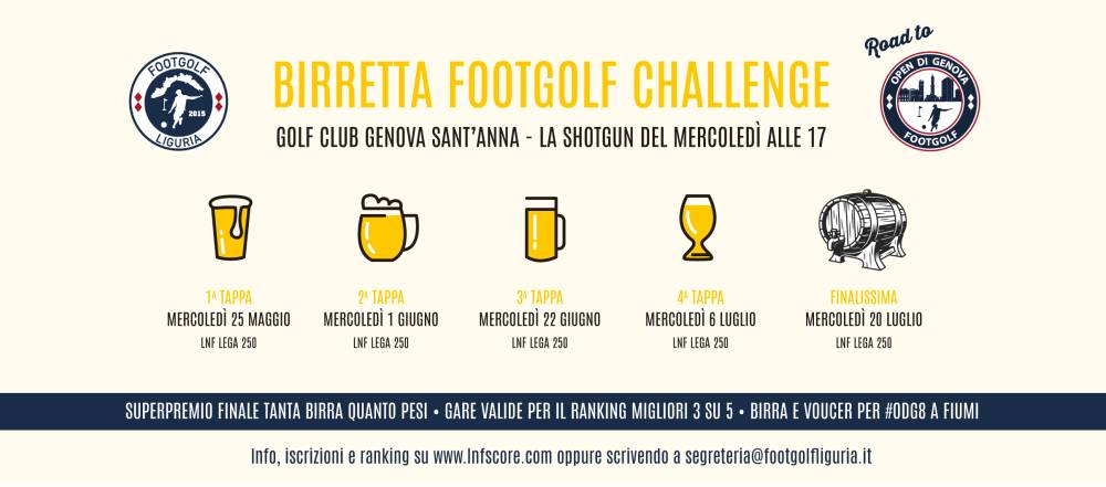 A grande richiesta il format Birretta Footgolf Cup si trasforma in Birretta Footgolf Challenge, 5 shotgun infrasettimanali pomeridiane con birra e free pass per l'Open di Genova 2022 a fiumi.