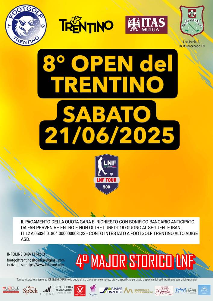 ISCRIZIONE CON PAGAMENTO ANTICIPATO A MEZZO BONIFICO BANCARIO ANTICIPATO ( DA PERVENIRE CON DATA MAX DI ACCREDITO 16 GIUGNO) IBAN : IT 12 A 05034 01804 000000003123 - CC INTESTATO A FOOTGOLF TRENTINO ALTO ADIGE A.S.D.