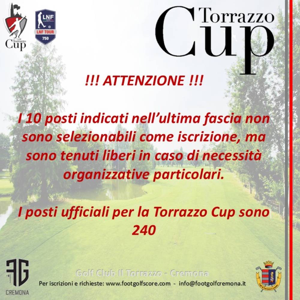 - N.B. I posti disponibili per il torneo sono 240, i 10 posti aggiuntivi e l'ultima fascia di gioco servono solo per eventuali bisogni organizzativi